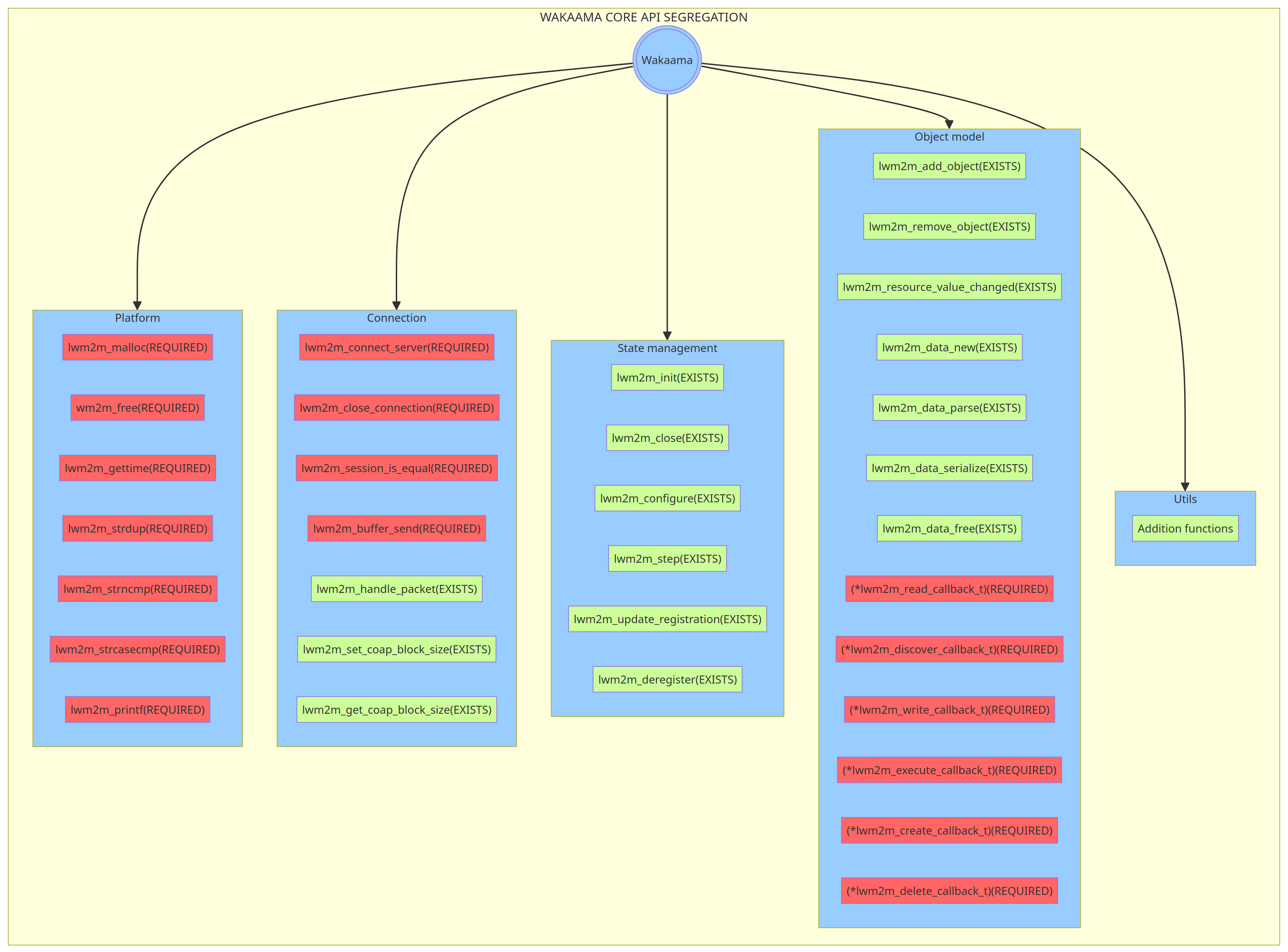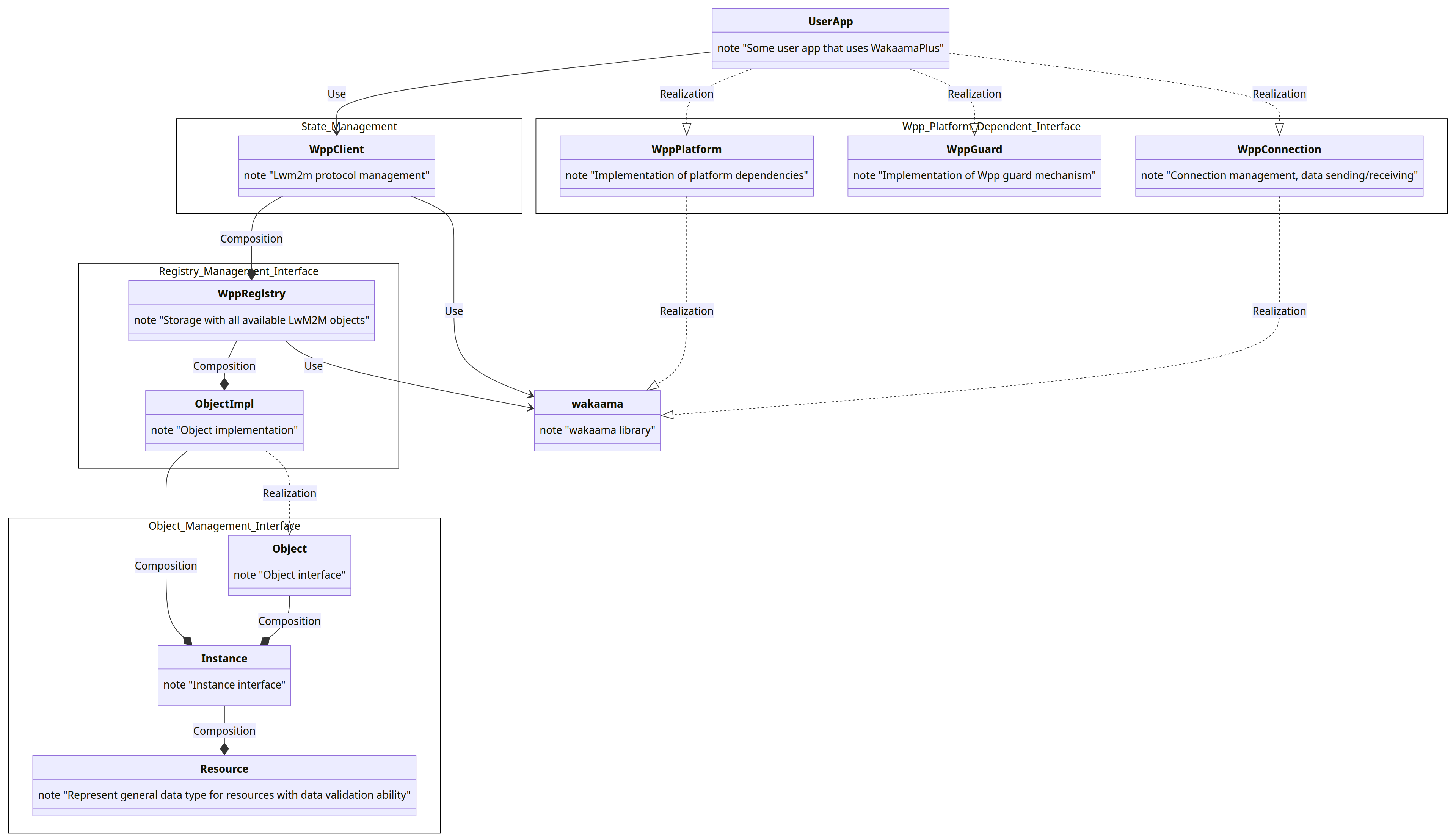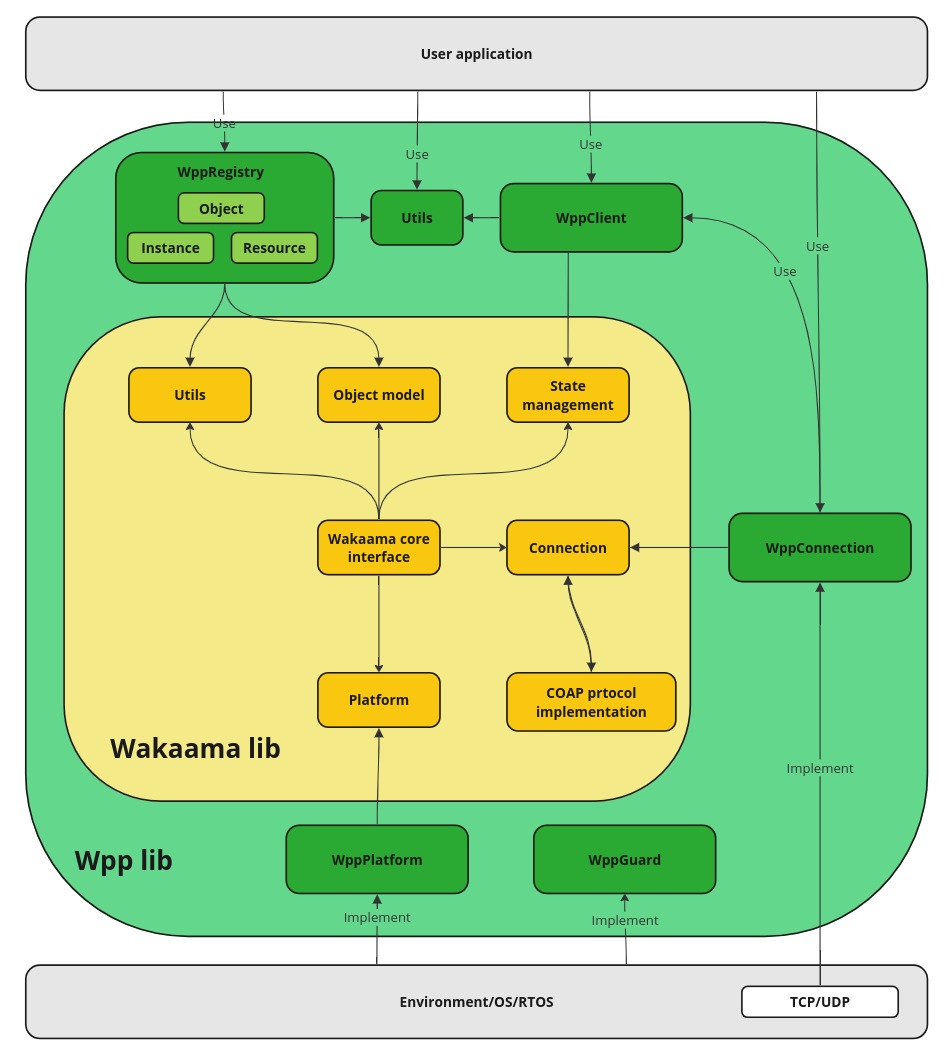 Since Wpp is built upon the Wakaama, the existing interfaces and capabilities of Wakaama affect the internal structure of Wpp. For a better understanding of what components should be present in Wpp, the Wakaama interface was segregated, based on it, the necessary components for Wpp were created.