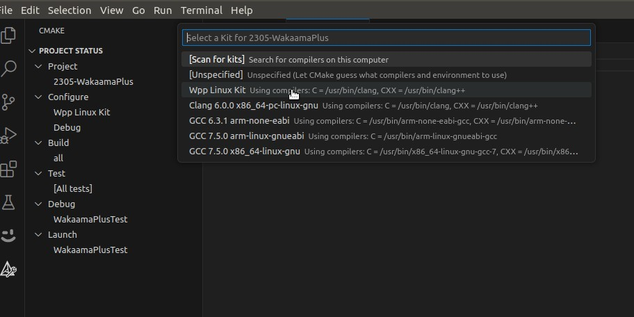 If you need to add custom Kit or modify the list of available kits it can be done in file vs- code-cmake-kits.json, that describes available kits. Also when you select needed kit in VS code, in addition to Wpp Linux Kit you can see other available on the PC that can be selected, if you need you can use them.